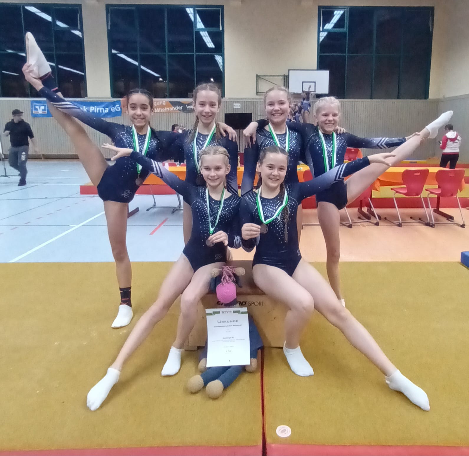 Am 08.11.2025 nahmen wir mit zwölf Turnerinnen an den Mannschaftsbezirksmeisterschaften in Pirna teil. Über mehrere Qualifikationswettkämpfe im Vorfeld auf Kreisebene konnten unsere AK 10/11 sowie unsere Kürmannschaft bis 13 Jahre die Tickets für diese Meisterschaft lösen. Zusätzlich verstärkten Emilia Teuscher und Marleen Hammer zwei Mannschaften aus Oberlichtenau. Unsere Mädels turnten an allen Geräten gute bis sehr gute Übungen. Auch wenn Turnen zu den Einzelsportarten zählt, galt es hier, für die Mannschaft zu denken und zu turnen. Dieser Gedanke wurde von den Mädels sehr gut umgesetzt. Immer wieder gab es während des Wettkampfes Motivation und Aufmunterung untereinander, so dass manche von uns im Wettkampf förmlich über sich hinauswuchs. Am Ende konnten wir folgende Platzierungen erturnen: